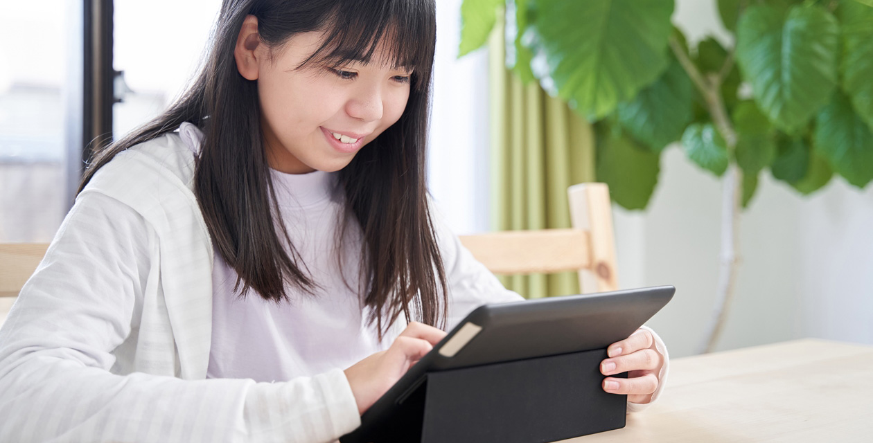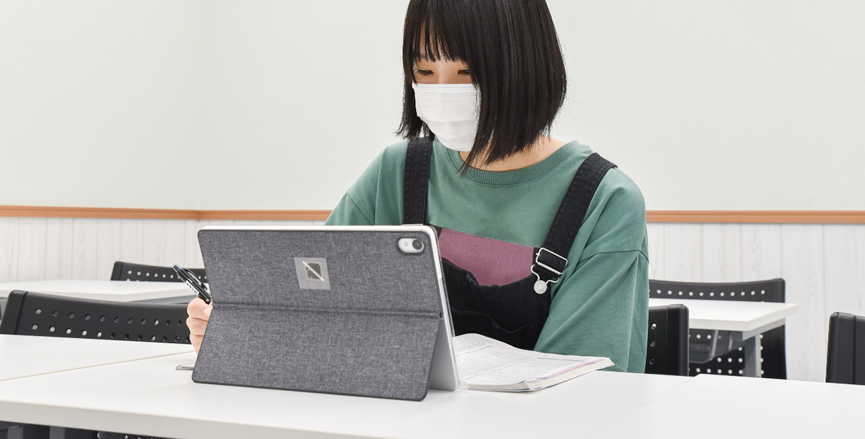 タブレットと専⽤テキストを併⽤した無学年⽅式の授業を⾏っており、講師のサポートを受けながら回数や時間に制限なく自由に通塾できるのが特徴です。